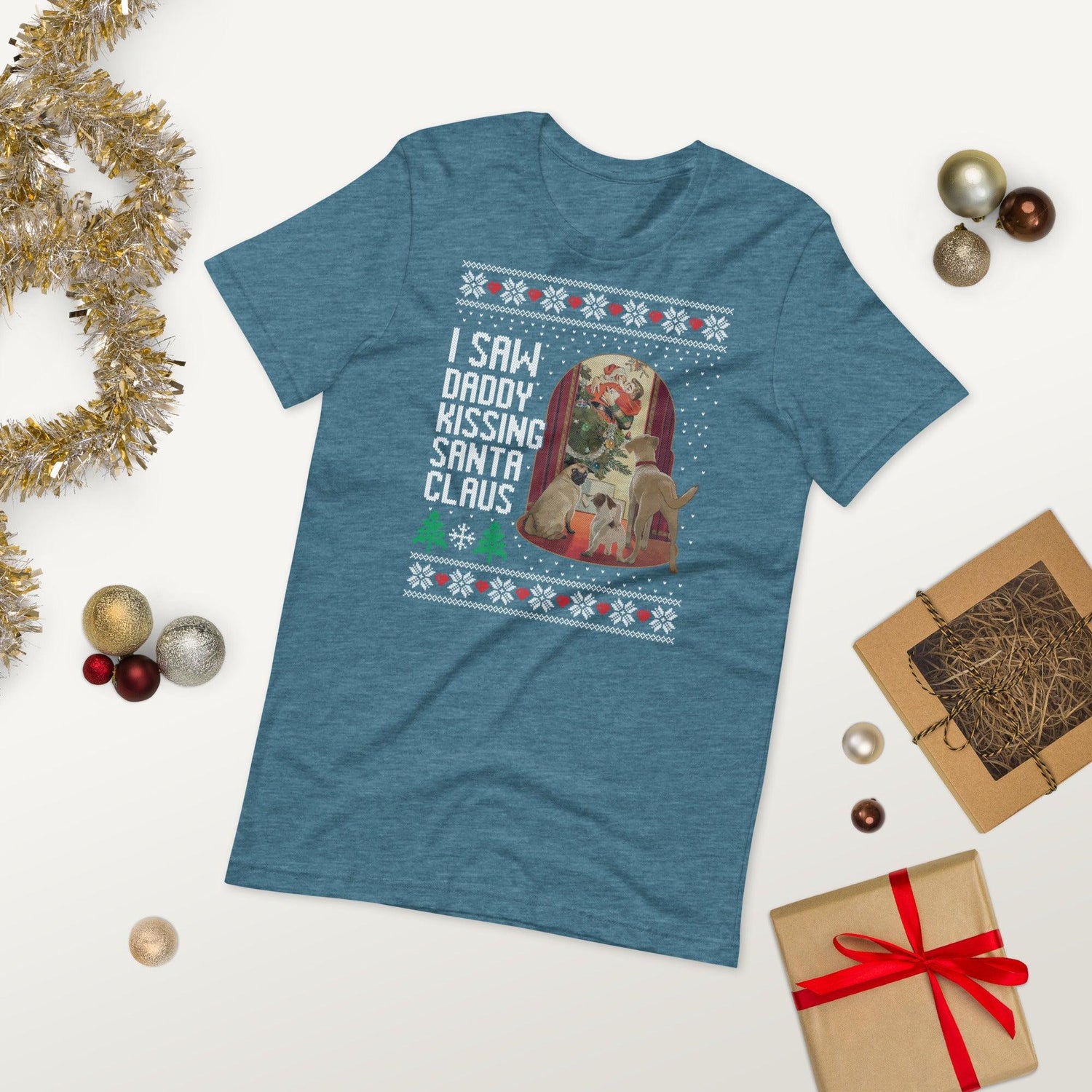 I Saw Daddy Kissing Santa Claus (Ugly Christmas) - T-Shirt / Heather Black / S is backordered and will ship as soon as it is back in stock.